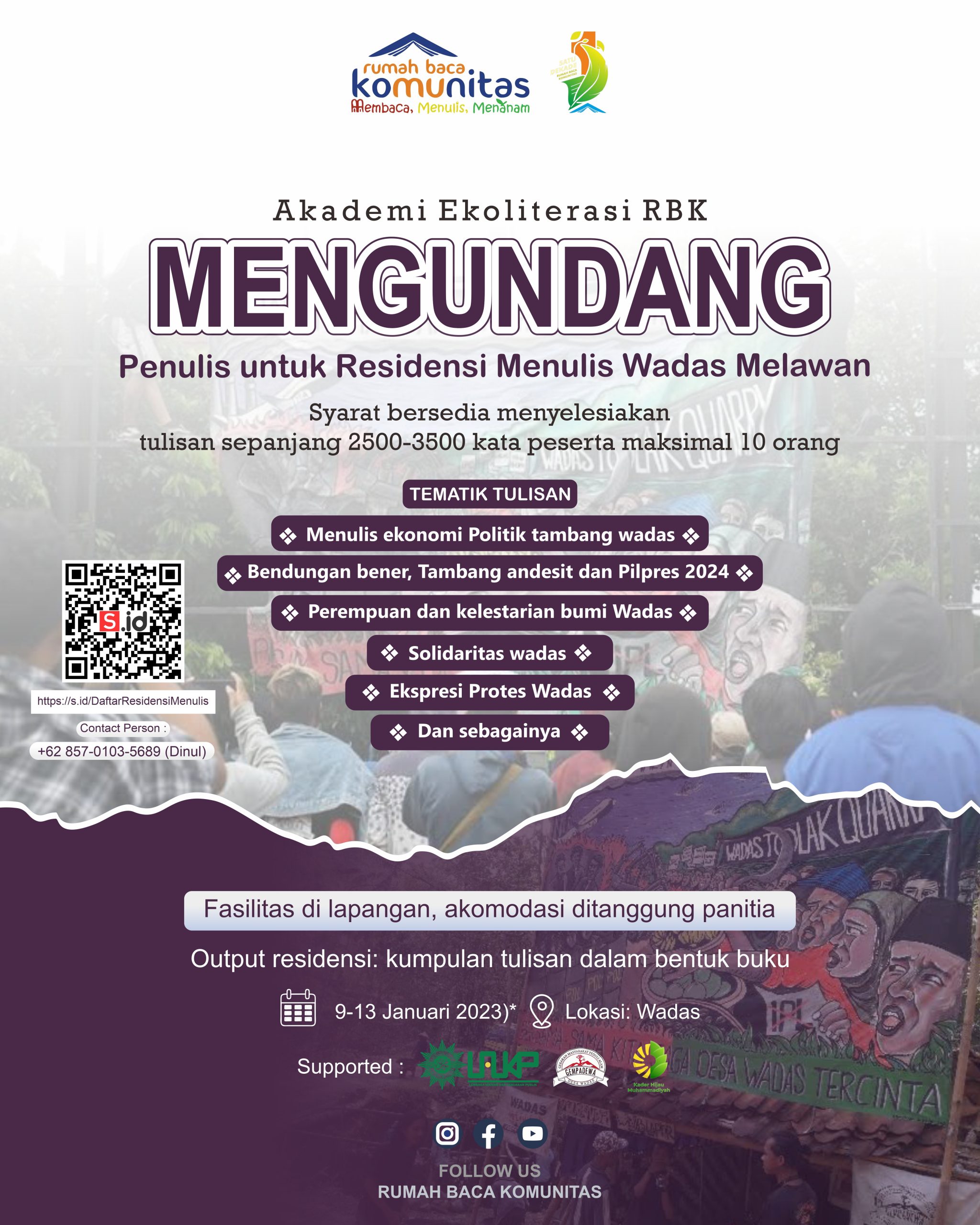Akademi Ekoliterasi RBK mengundang penulis untuk Residensi Menulis Wadas Melawan sebagai panggilan solidaritas dalam perlawanan ilmu dan pengetahuan. Sebab, kekuasaan berjalan di Desa Wadas tidak hanya mempraktikan penindasan. Lebih dari itu, di saat yang bersamaan kekuasaan juga memproduksi pengetahuan untuk mengukuhkan posisinya.