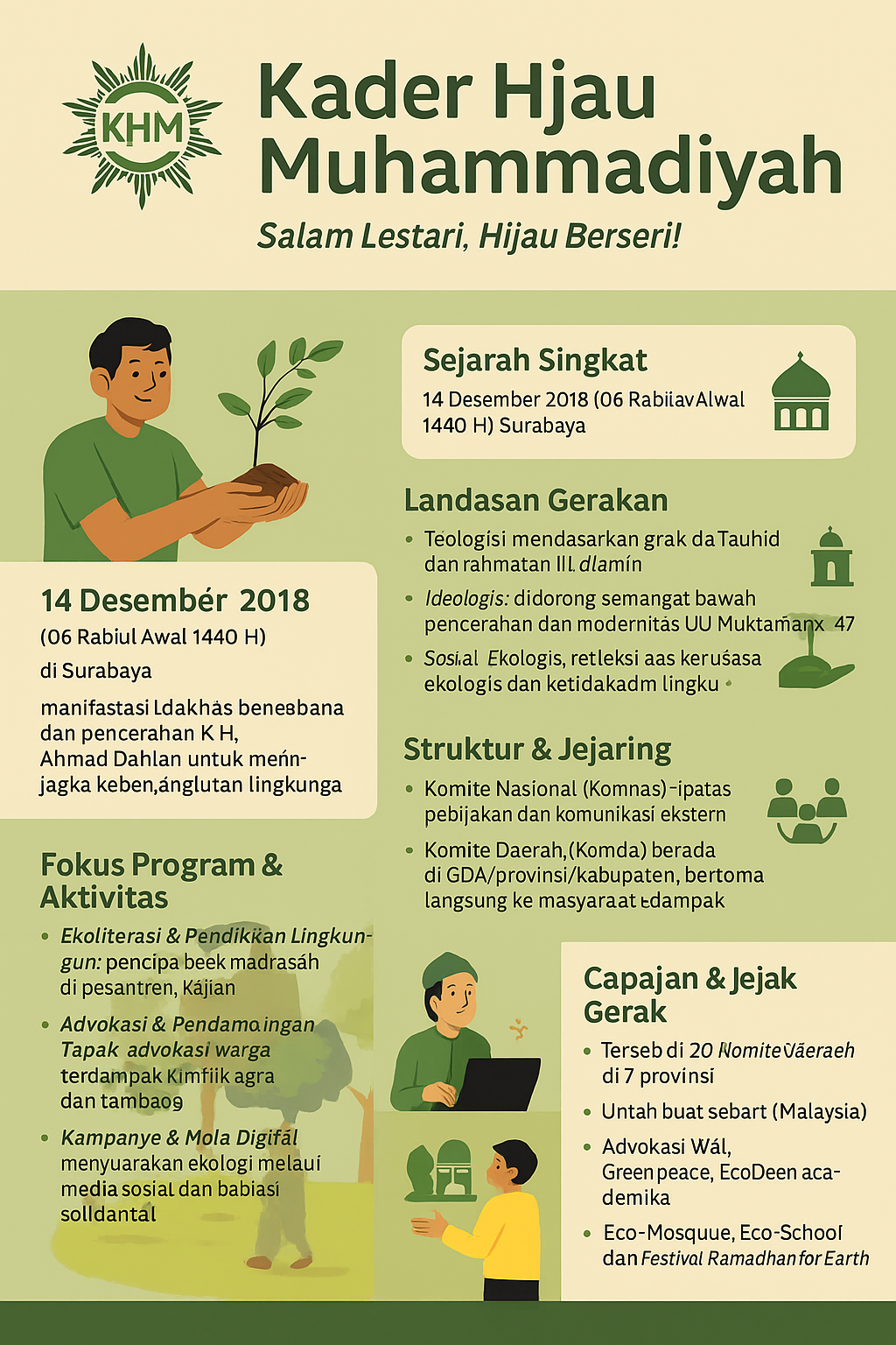 Kedua, upaya komunitas dalam literasi ekologi dan gaya hidup hijau telah menunjukkan beragam nuansa dalam wacana Islam dan ekologi. Islam Bergerak, misalnya, mengaitkan isu lingkungan dengan demokrasi dan republikanisme. Mereka menyebarkan narasi ini melalui artikel, blog, dan platform diskusi, dan nada tulisan-tulisannya cukup kuat dan reformis. Kendati memiliki misi yang sama, KHM berpijak pada pendekatan yang lebih lunak, tutur kata yang halus dan nada yang netral, dalam semangat Al Ma’un, teologi pembebasan Muhammadiyah yang muncul pada tahun 1990-an dan dikembangkan melalui Ahmad Dahlan menjadi gerakan untuk menggaet kader-kader muda Muhammadiyah.