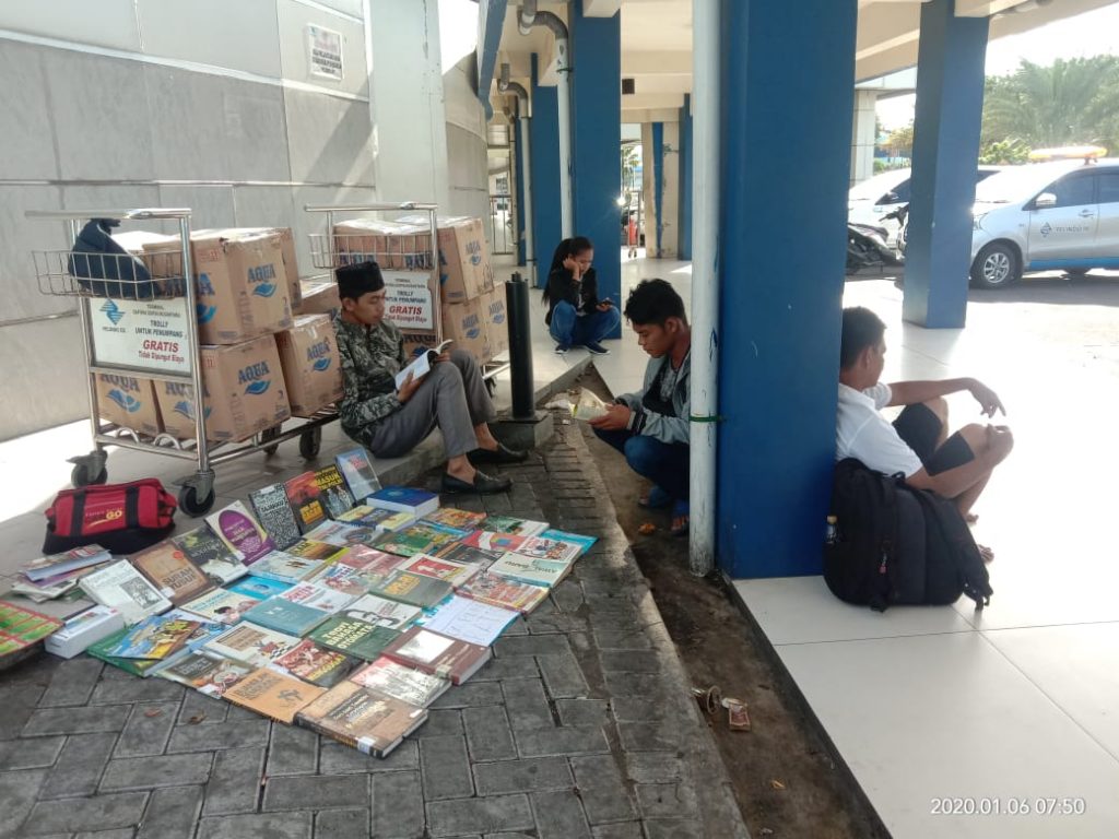Tadi pagi dia mengabarkan kalau sudah tiba di Pelabuhan Tanjung Perak Surabaya. Sembari menunggu kapal, ia buka lapak baca. La Ode memang selalu begitu. Sudah kebiasaan dia juga merespon tempat-tempat publik sebagai ruang baca. Ia sudah terlatih melakukannya. Bahkan ketika mampir sholat di mushola atau pas depan sekolah pun, sangat mungkin ia akan menggelar lapak buku. Ia sedang mengangkut berkardus-kardus buku menyebrang laut. Di foto, ia tampak pake peci dan jaket loreng.